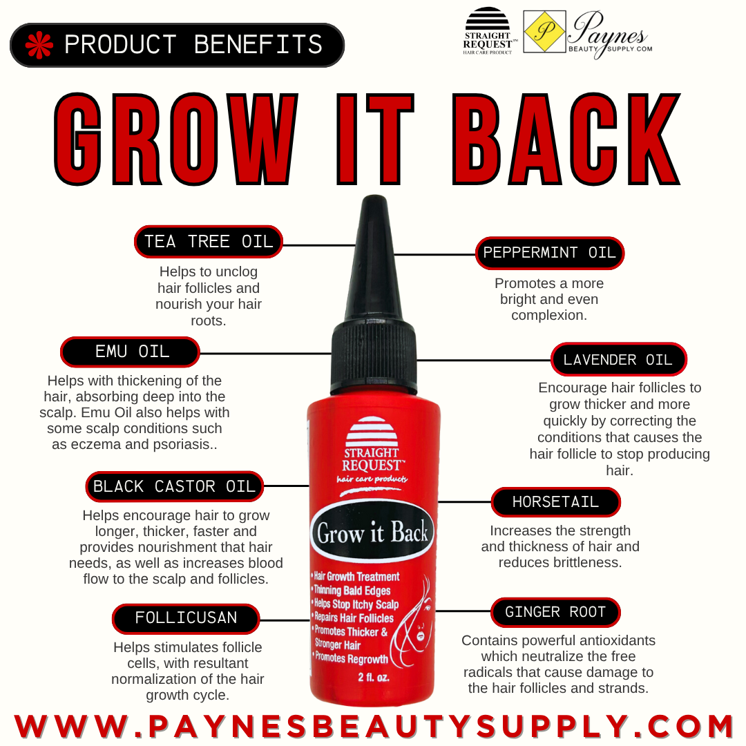 Grow It Back is one of the most powerful hair-growth formulas ever created, combining a targeted blend of premium natural ingredients designed to stimulate the scalp and support healthy regrowth. Infused with emu oil, peppermint oil, lavender oil, horsetail herb, and ginger root, this potent treatment works as a “comeback team,” each ingredient addressing a specific scalp or hair concern with unmatched effectiveness.